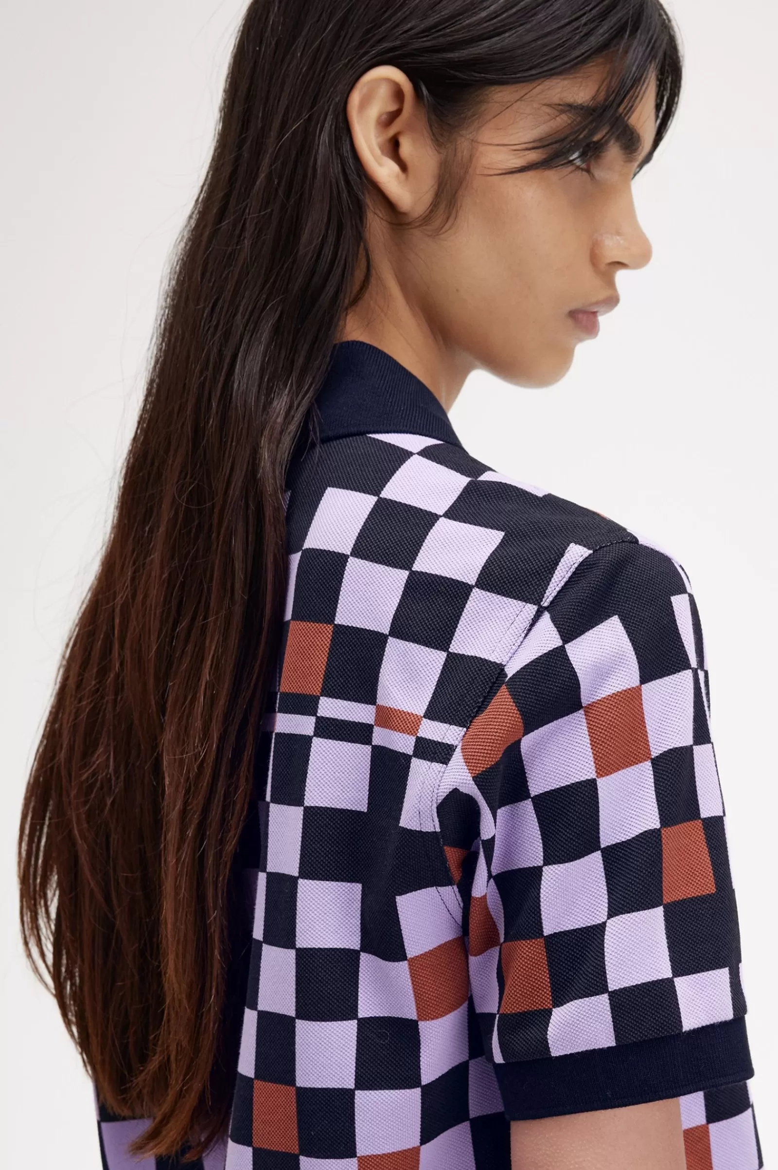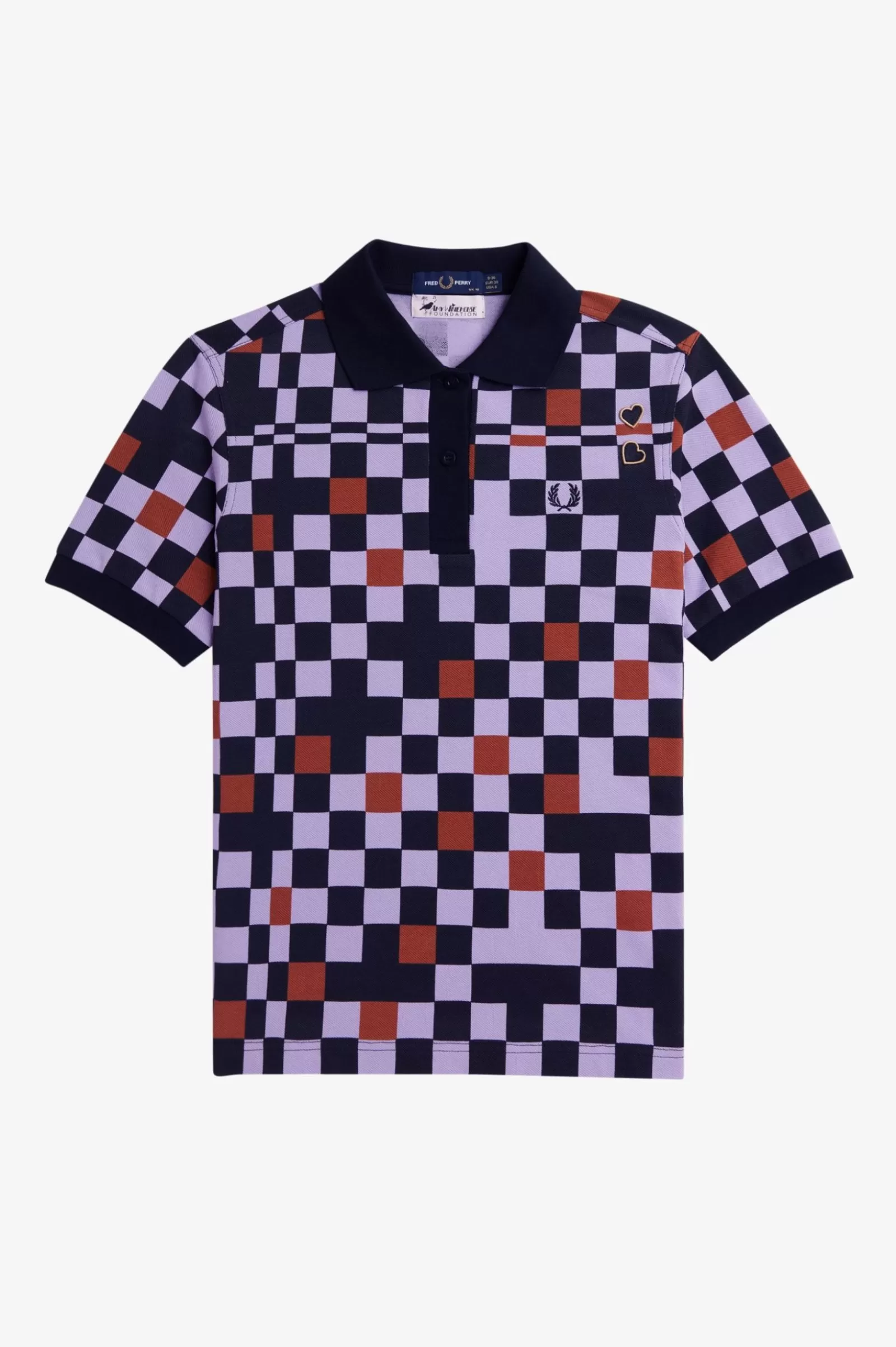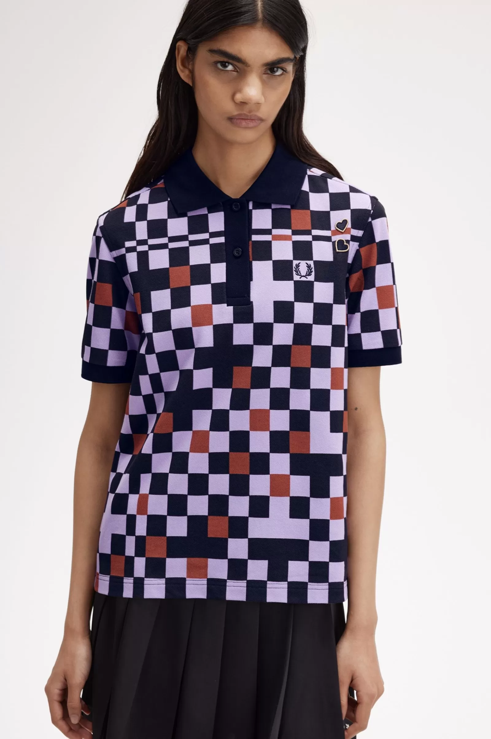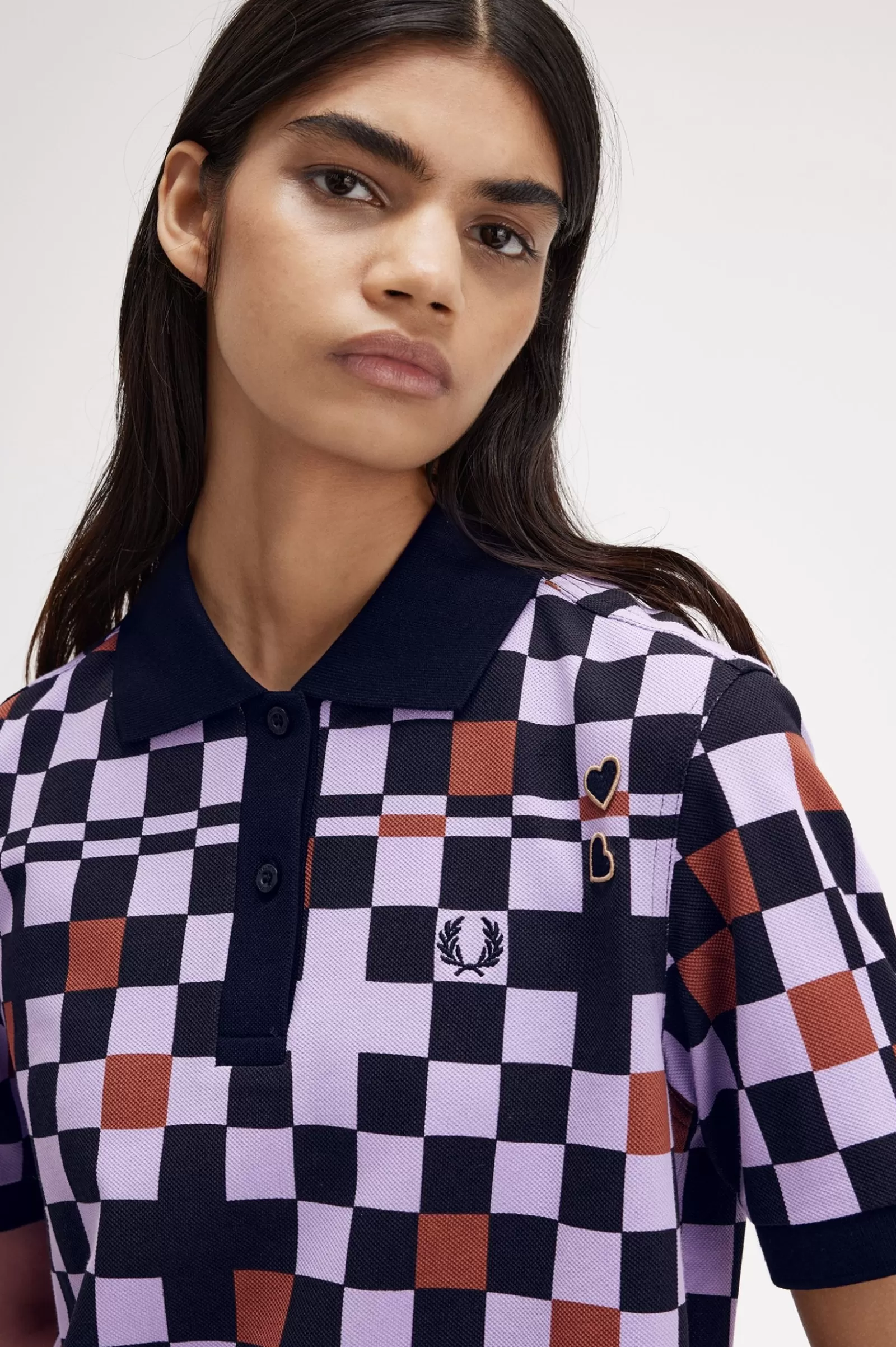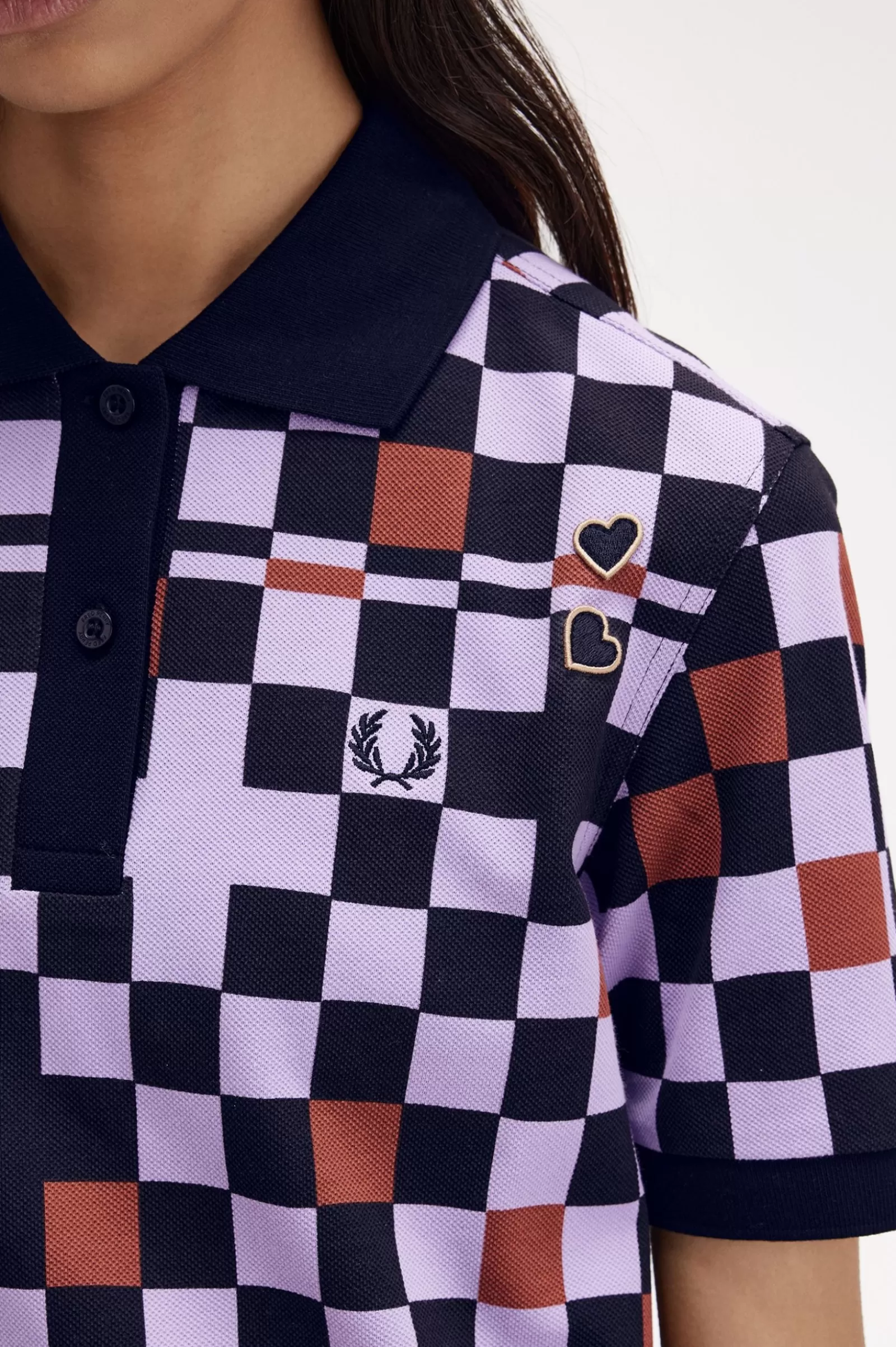 Cotton piqué fabric with printed chequerboard / Regular fit / Flat knit collar and cuffs / Amy embroidered heart patches on the left hand shoulder / Embroidered Laurel Wreath logo on the left hand chest